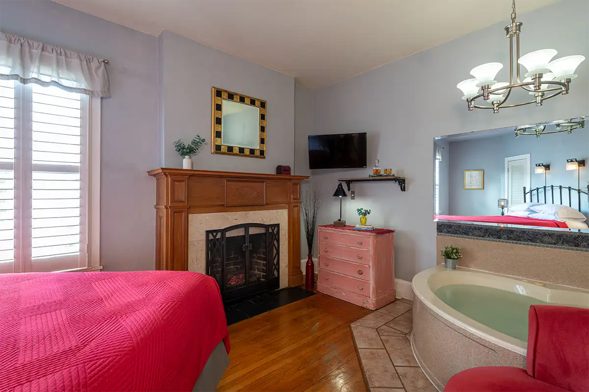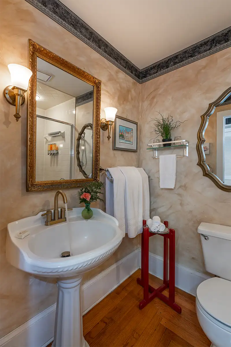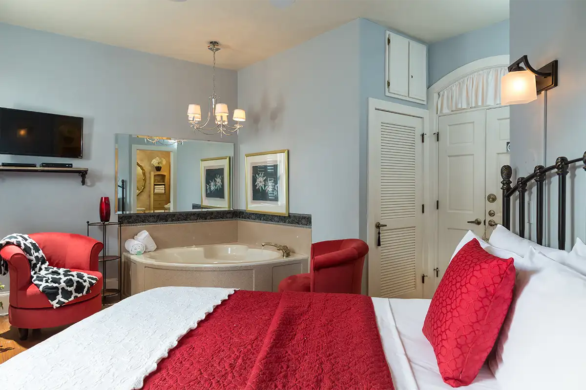 Saragossa welcomes you on the first floor of our downtown Saint Augustine B&B. Newly added, this room includes a queen bed and smooth wood floors for a cozy atmosphere. The highlight is a luxurious two-person jetted garden tub beneath a sparkling chandelier, along with a walk-in shower for your daily comfort.