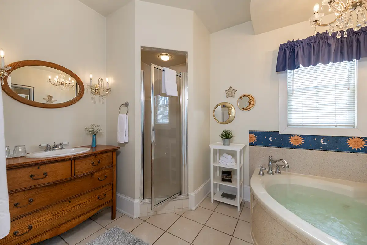 Sevilla is your spacious sanctuary on the second floor of our B&B in downtown Saint Augustine. The room includes a king bed, a small desk, and a private bath with a two-person jetted tub under a glittering chandelier, plus a walk-in shower. Double French doors open onto your own south-facing balcony, where you can look out over Saint Augustine and Saragossa Street.