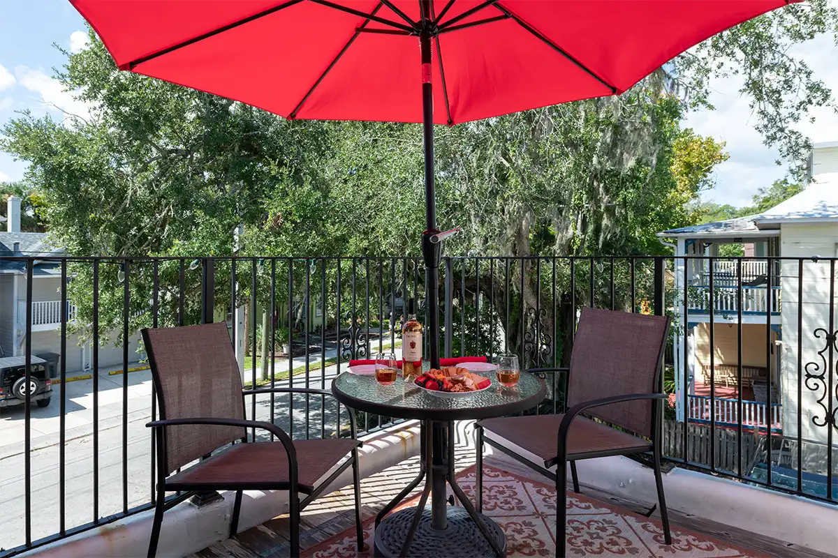 Sevilla’s 165 square feet of living space, 80 square foot bathroom, and 88 square foot balcony create a roomy and comfortable setting for two. Whether you’re soaking in the jetted tub or relaxing outside with a cool drink, you’ll find plenty of reasons to stay longer and enjoy every part of downtown Saint Augustine from your B&B home base.