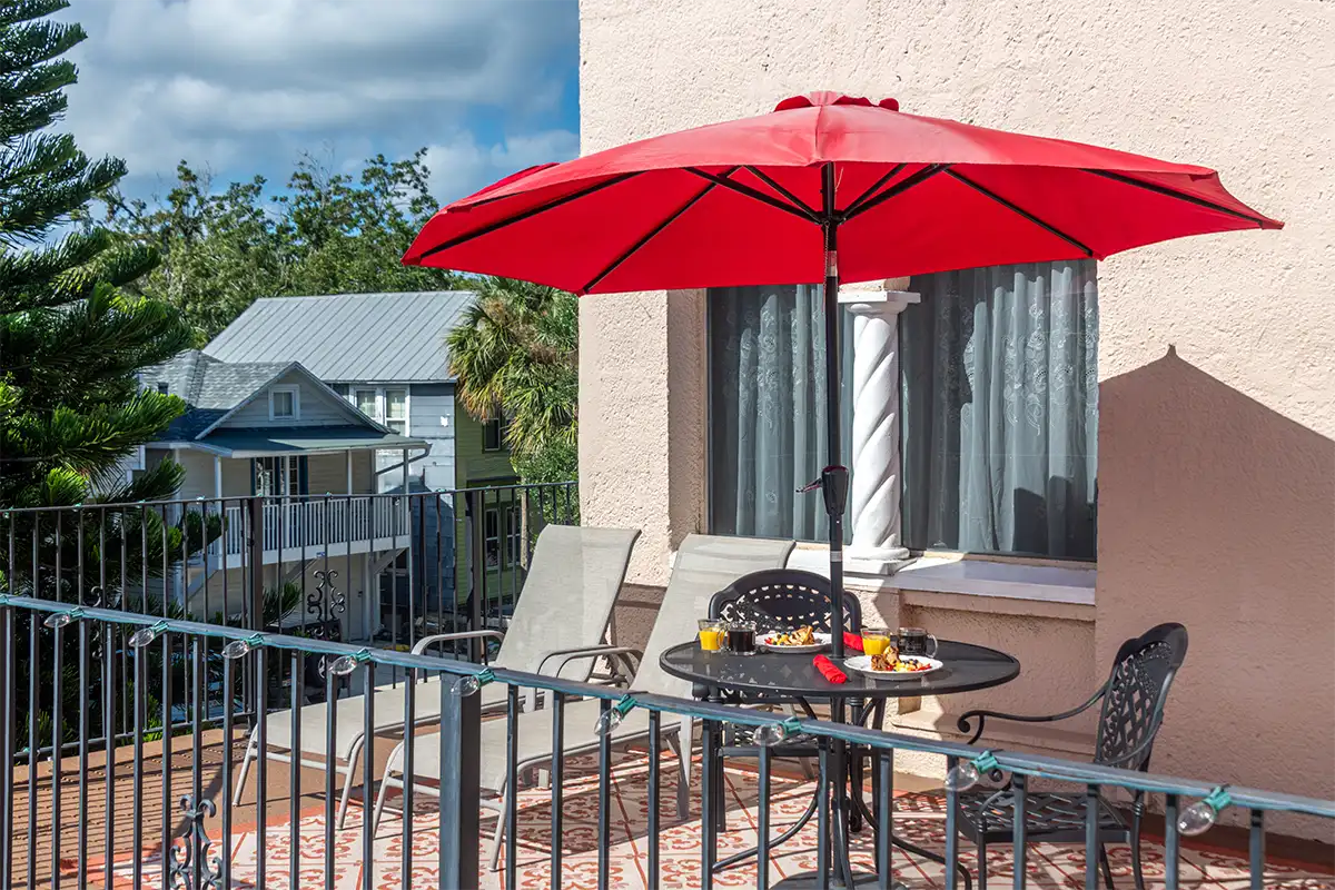 With 187 square feet of living space, a spacious 126 square foot bath, and a huge 252 square foot balcony, Valencia offers the ultimate B&B experience for two guests. Book several nights to explore Saint Augustine’s vibrant art scene, then return to your balcony for a quiet evening above downtown.